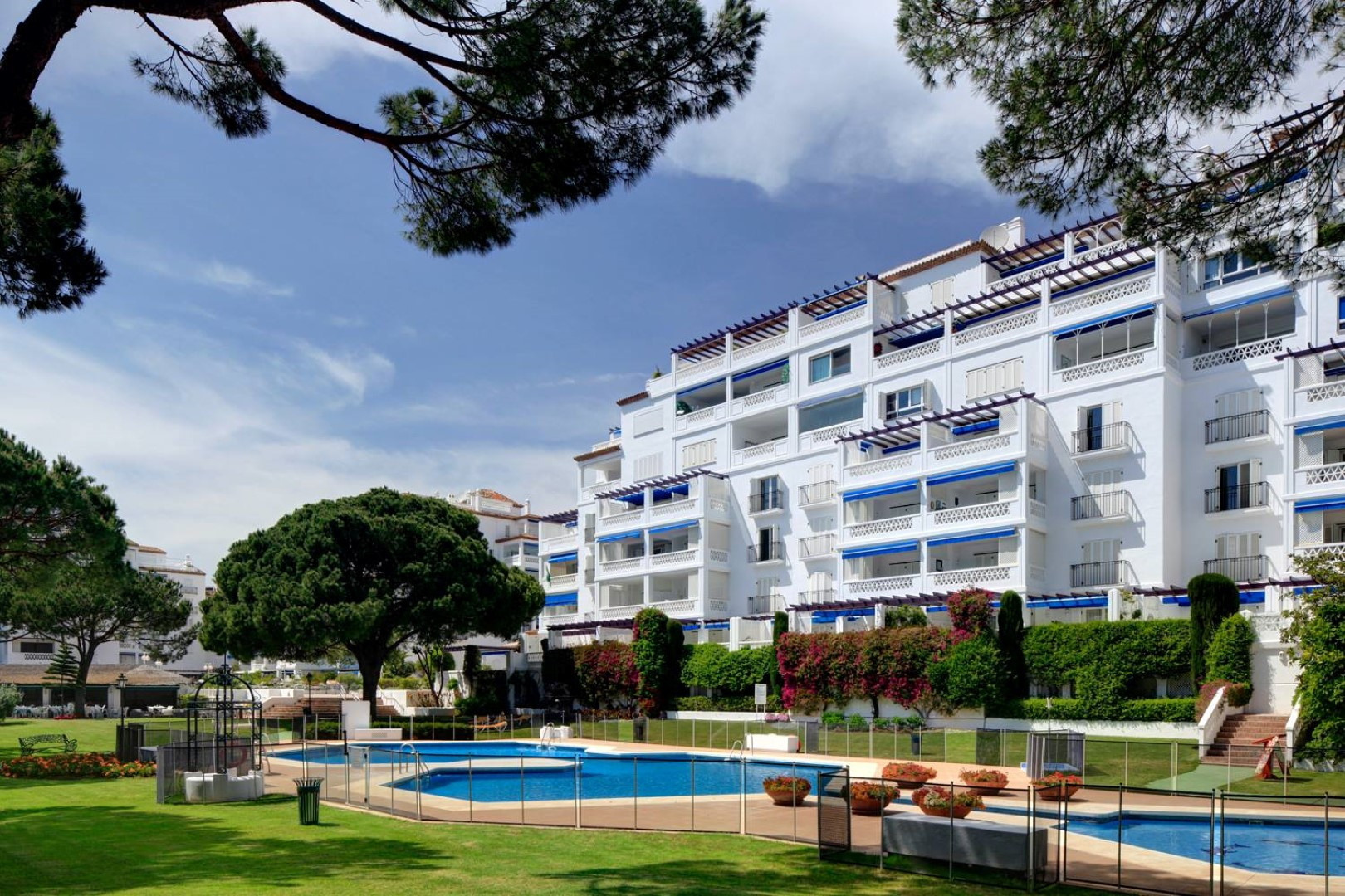 This property is ample and offers a good distribution, fully furnished in a classical style the property boasts a lovely entrance hall leading to a fully fitted kitchen with adjacent breakfast area and independent laundry room. 1 bedroom with bathroom en-suite is located to the other side of the hall. A wonderful living room with 2 sitting areas and a formal dining area all opens onto a wide south facing covered terrace enjoying wonderful views over the gardens and to the swimming pools. 2 bedrooms with bathrooms, 1 en-suite to one side of the living areas and to the other side a further 2 bedrooms, the master bedroom with en-suite bathroom also south facing and the other with adjacent family bathroom. This property offers air conditioning hot and cold as well as marble floors and 2 parking spaces in the underground garage.